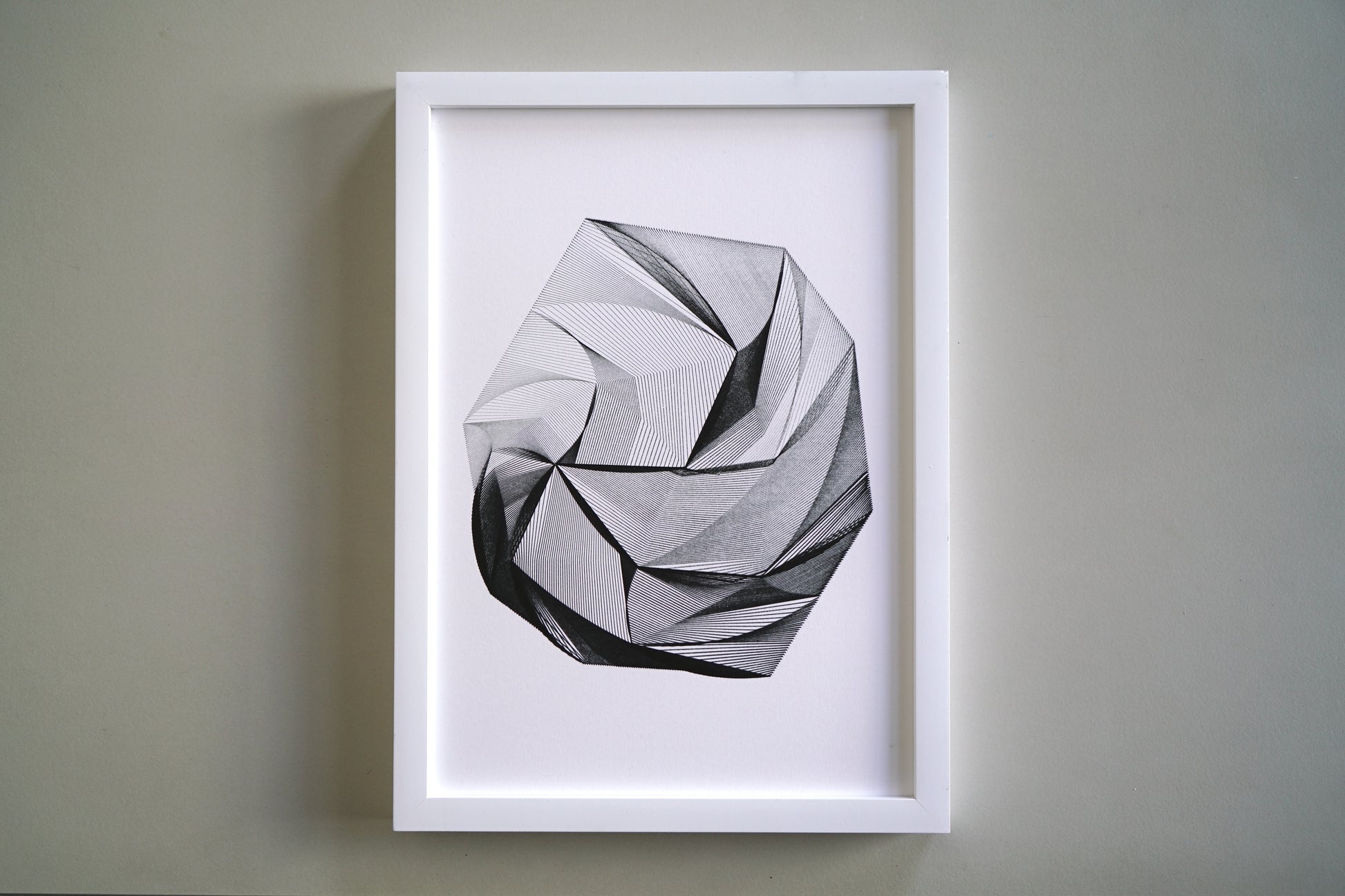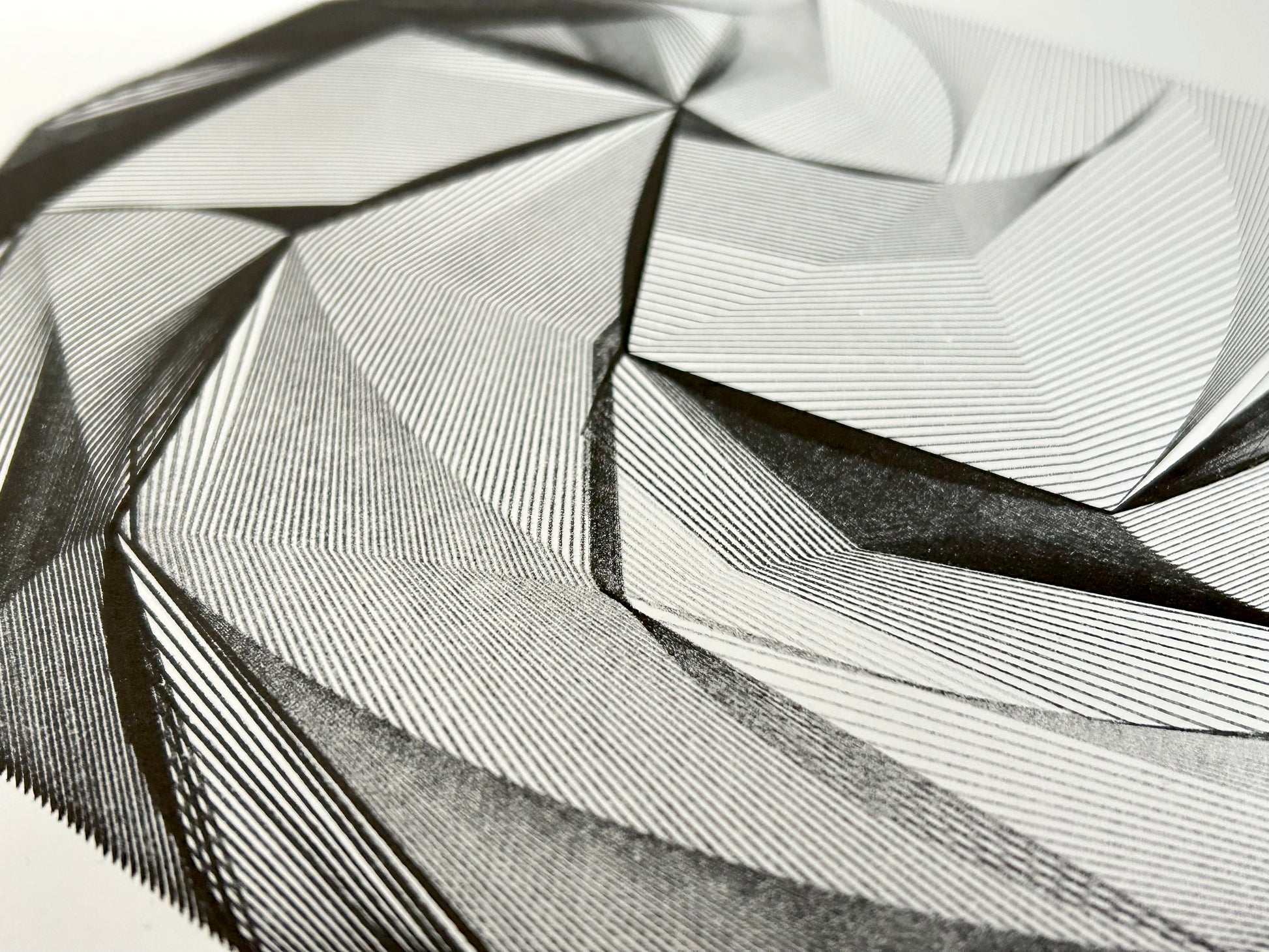 Expertly crafted with a geometric style reminiscent of a singularity, where lines seamlessly flow across a 3D surface. The varying density in different sections produces striking thick black contours. Created with precision using a fine ink brush on high-quality vellum paper, 300gsm and sized at 210 x 290mm.