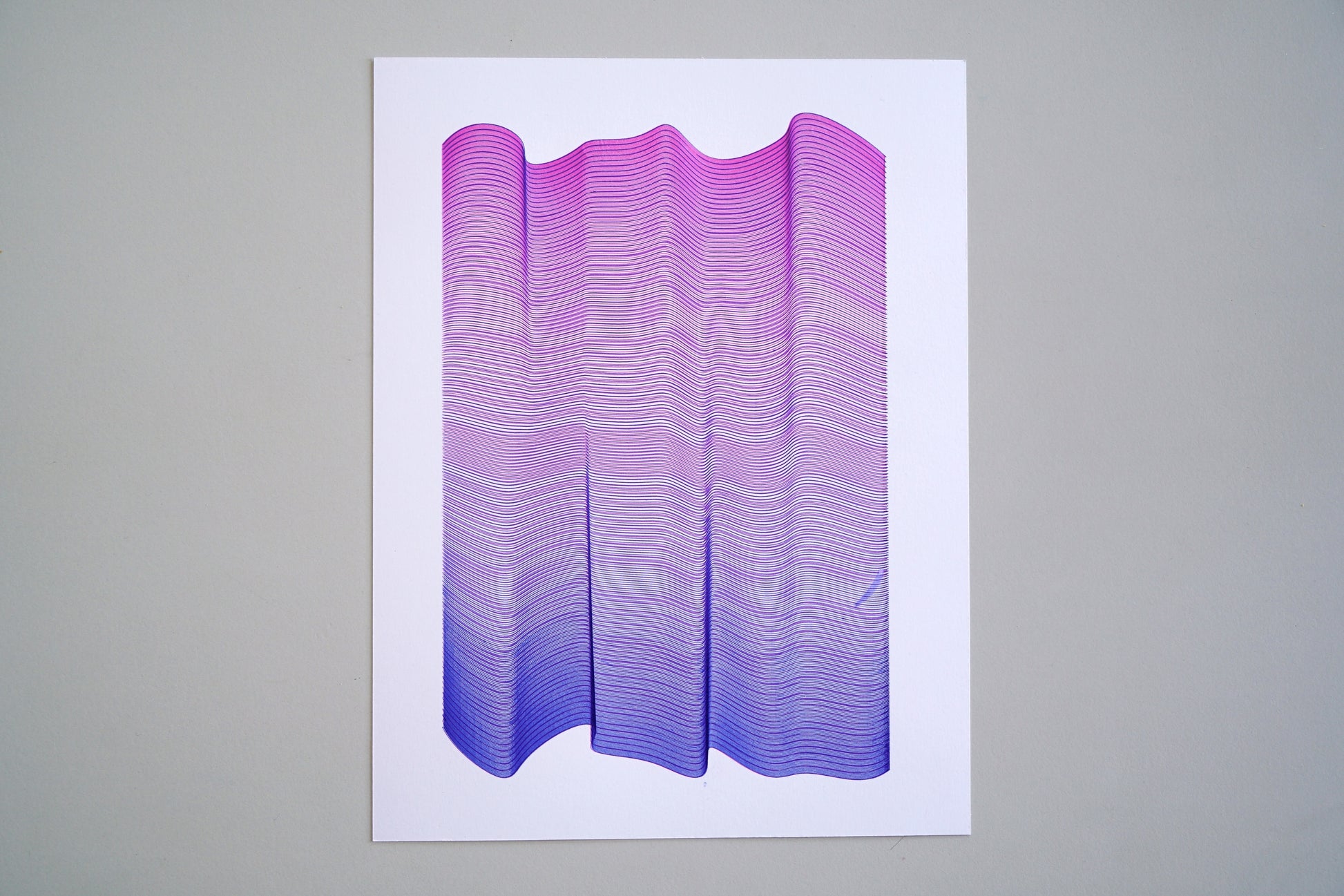 The phenomenon known as the moire effect is visible on a surface that gradually changes from pink to blue. This optical illusion is graphically represented on 300gsm vellum paper, measuring 210 x 290mm.