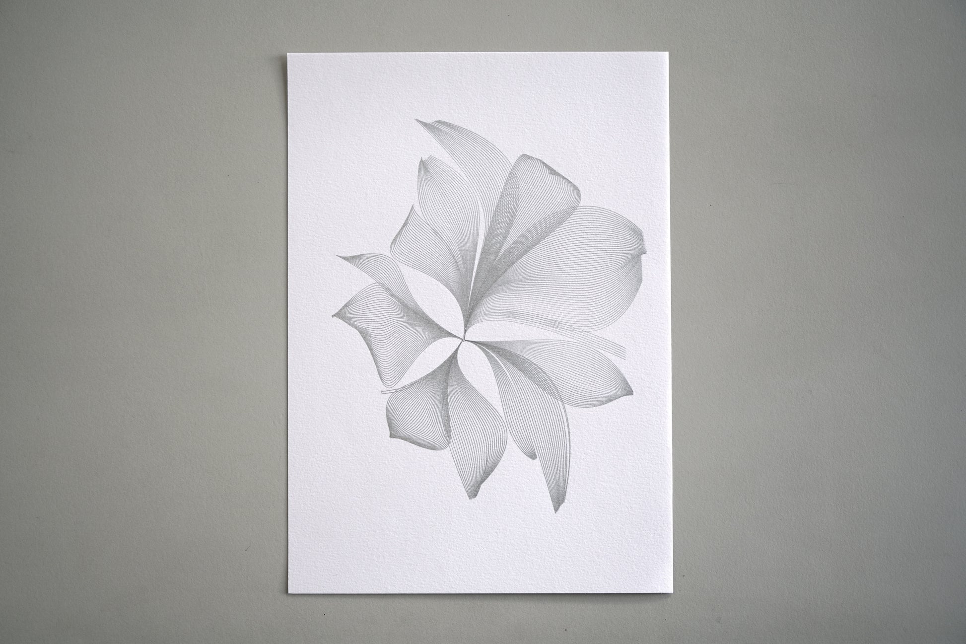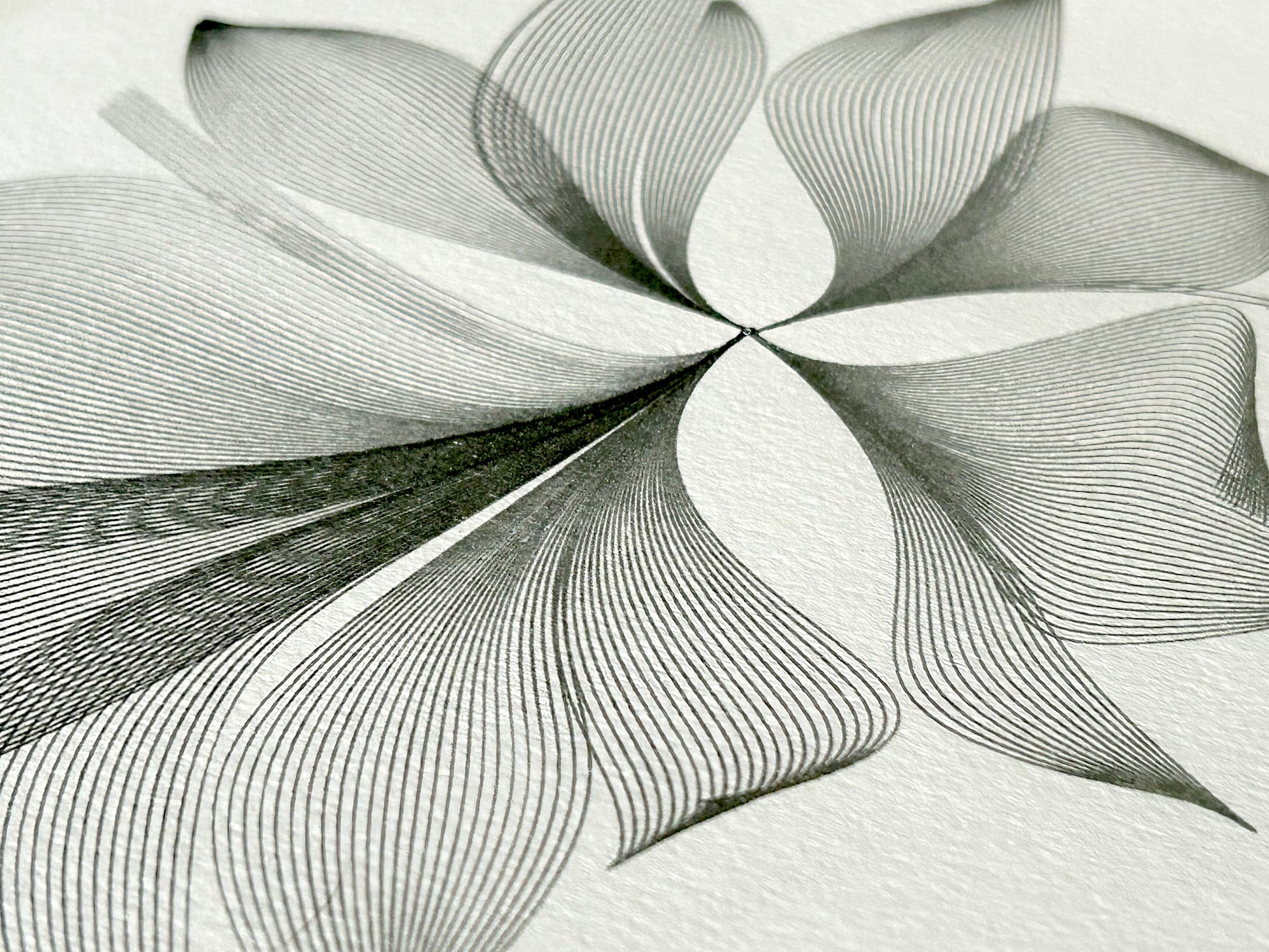 This artwork features a geometric design based on a singularity, causing all lines to smoothly flow across a 3D surface. By altering the density in various sections, thick black contours are formed. The design is created using a fine sliver pen brush on 200gsm vellum paper, measuring 210 x 290mm.