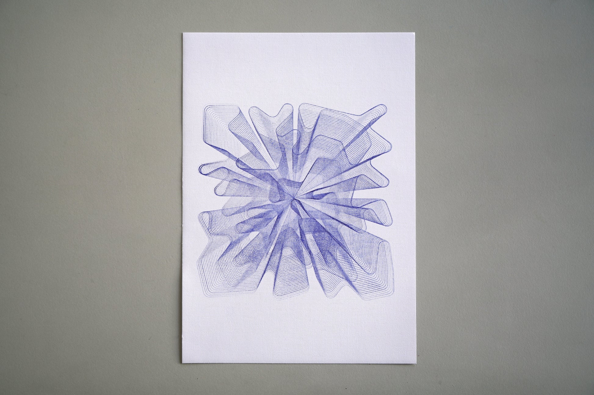 Apply the principles of geometry to the tension in a rubber band algorithm, reflecting the tension we often face in life as we are pulled in diverse directions (32 points and contoured). Utilize a fine blue pen and 200gsm 210 x 290mm fine paper for precise plotting.